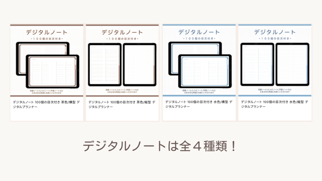 デジタルノートは全4種類(茶色の横型/縦型、水色の横型/縦型)あります。